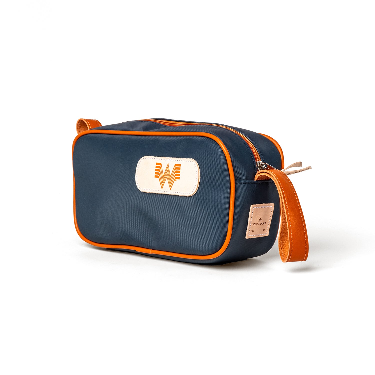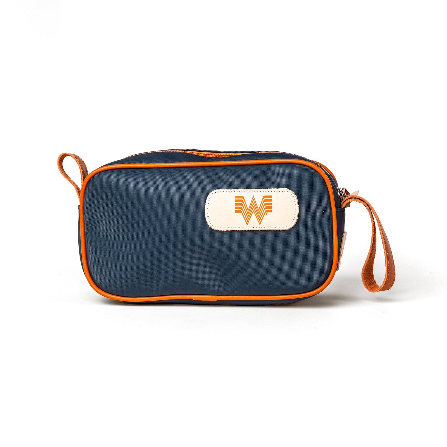 A perfect toiletry kit for travel. This limited-edition Whataburger shave kit featuring a navy coated canvas and orange natural leather trim can carry all your essentials. Also great for carrying meds and electronics accessories.