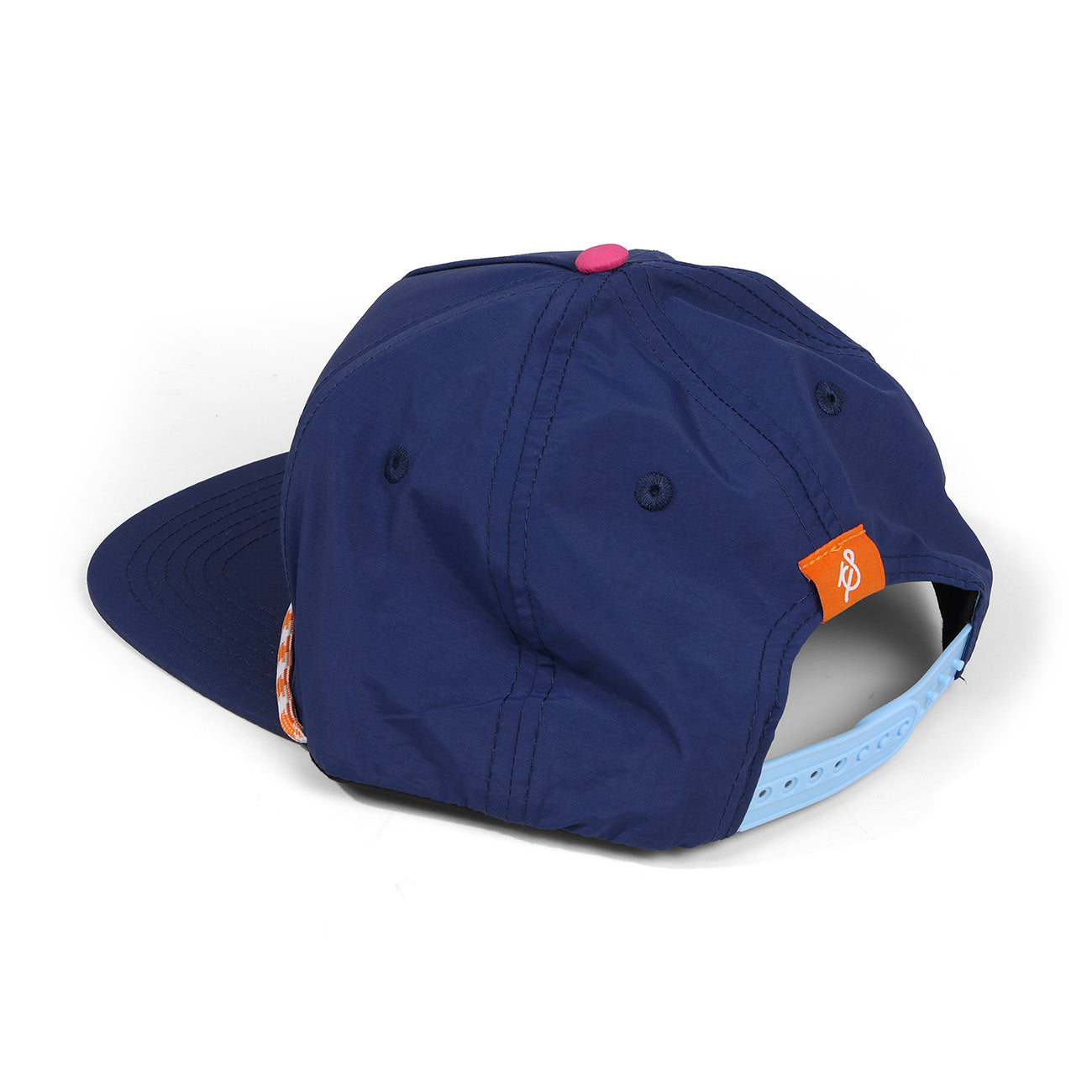 – Color: Navy with light blue/pink bottom bill and orange/white striped rope detail