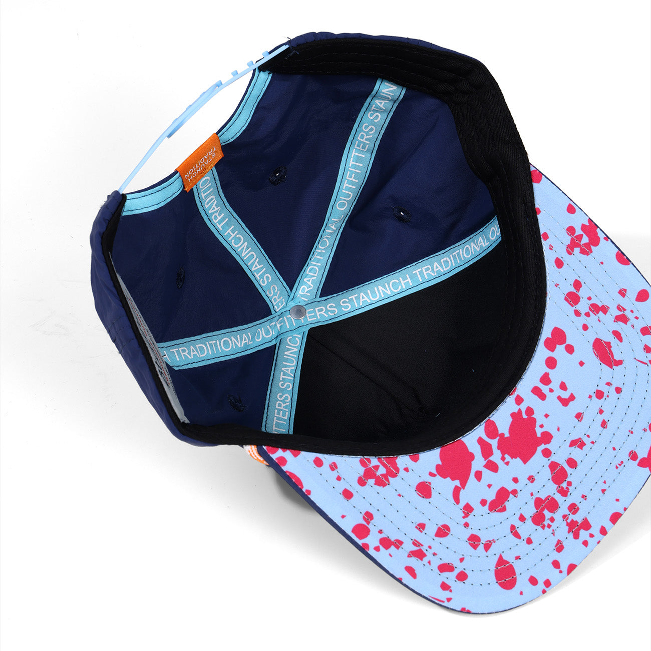 This Navy Script Staunch Collection Hat brings a splash of fun with its light blue and pink bottom bill, accented by an orange and white striped rope detail. The 3D puff embroidery of the Whataburger script logo pops with playful charm, while the subtle 24/7 embroidery and drip pattern add a cool, unexpected twist. Perfect for adding a vibrant touch to your everyday look!